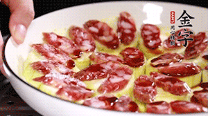 將香腸片鋪到絲瓜圈上。