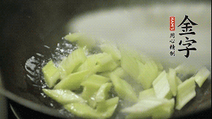 油7成熱時(shí),入西芹煸炒至7成熟,再放入百合和香腸翻炒均勻。