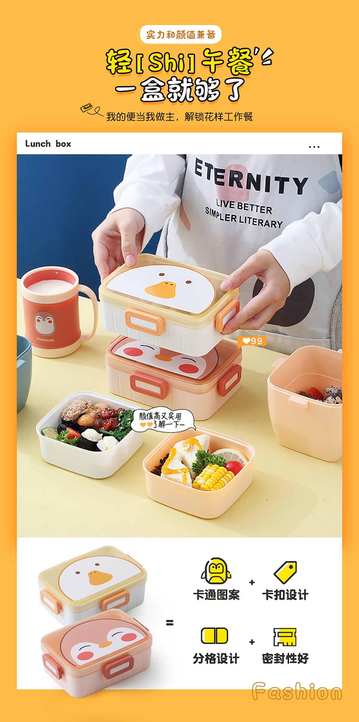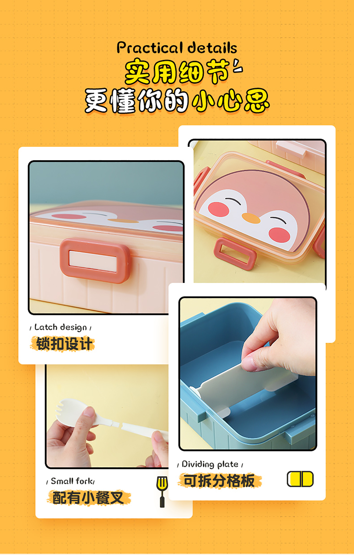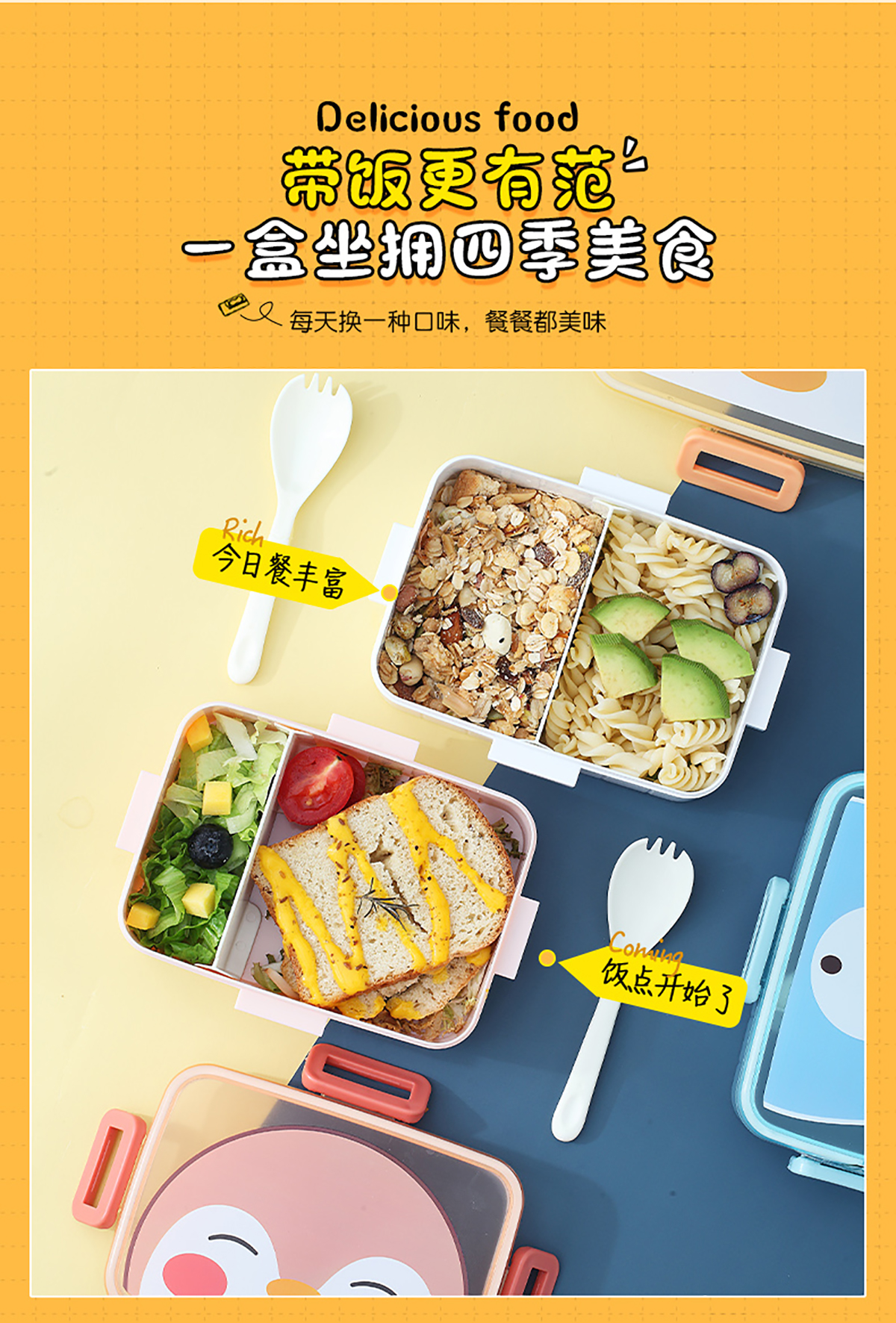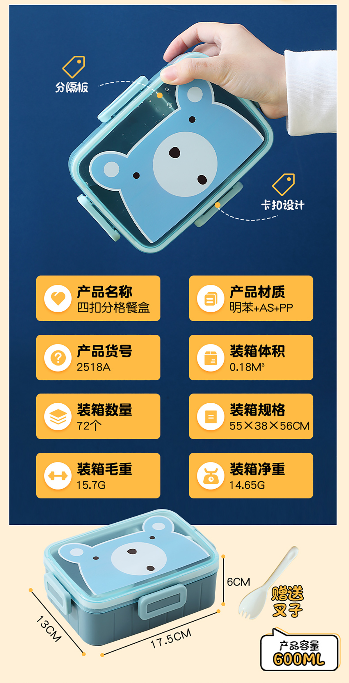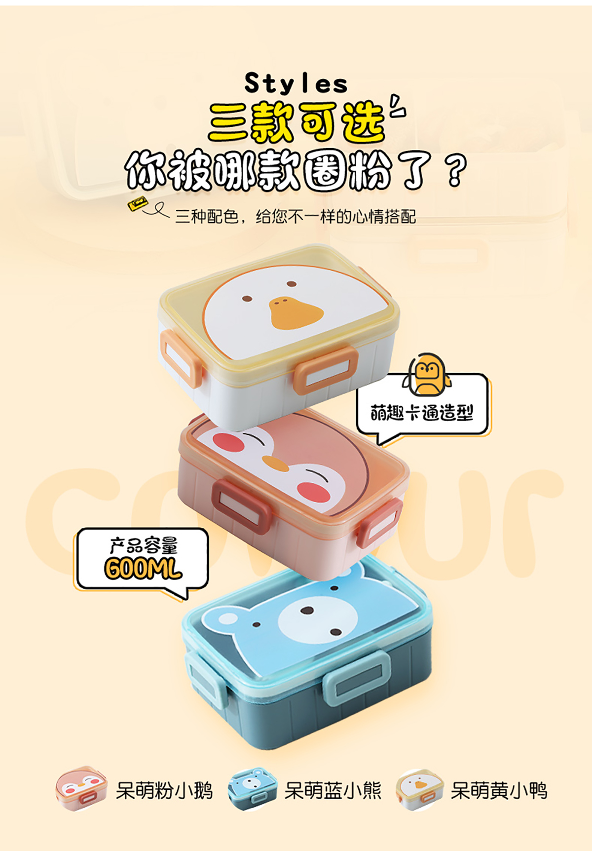 卡通方扣分格飯盒600ml