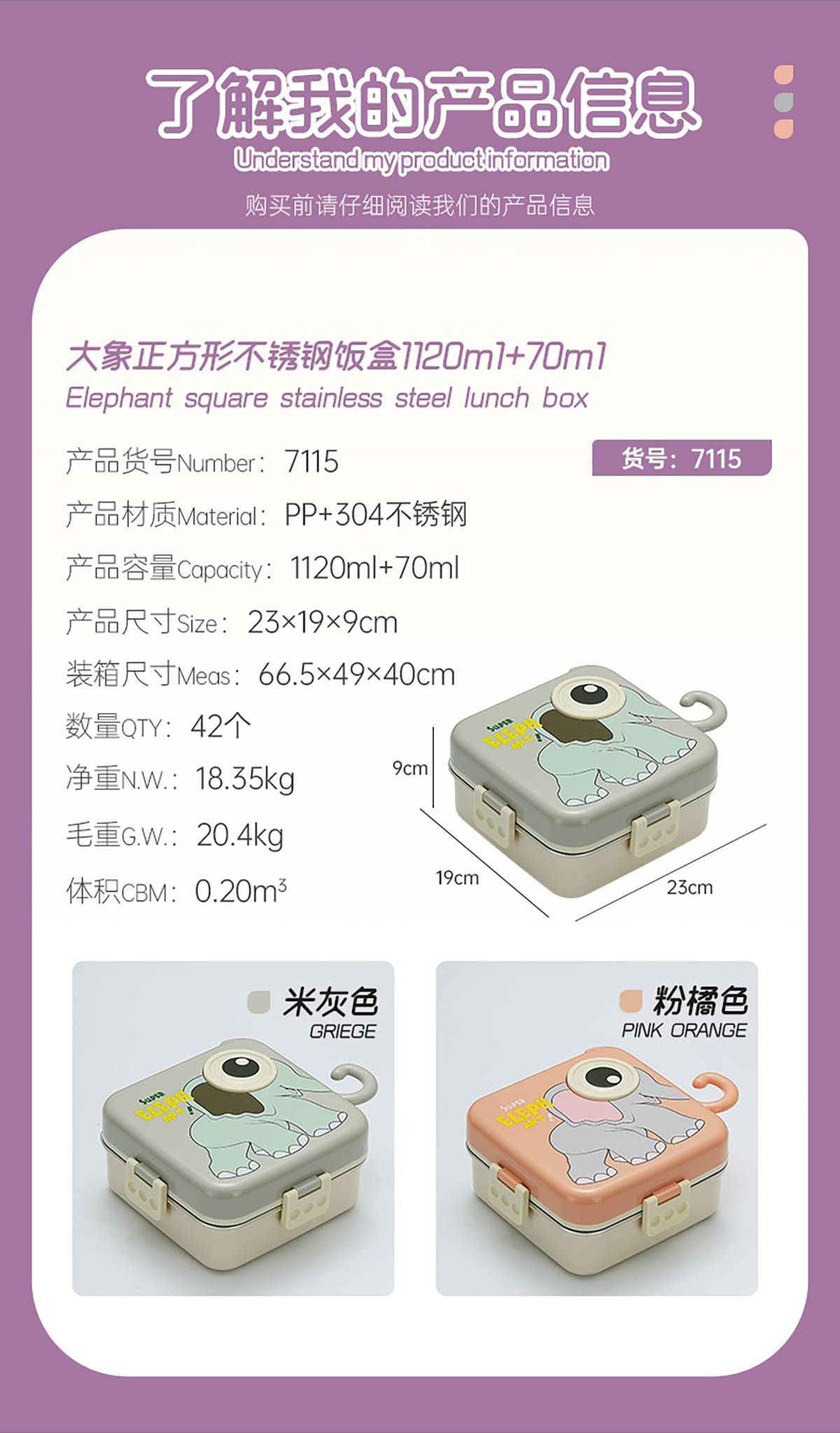 大象正方形不銹鋼飯盒1120ml+70ml