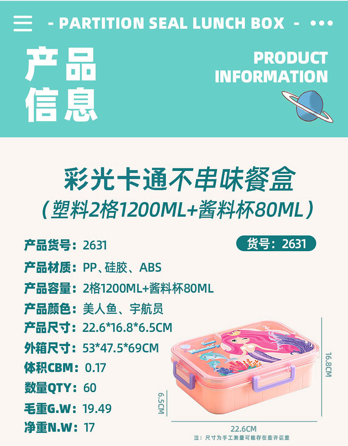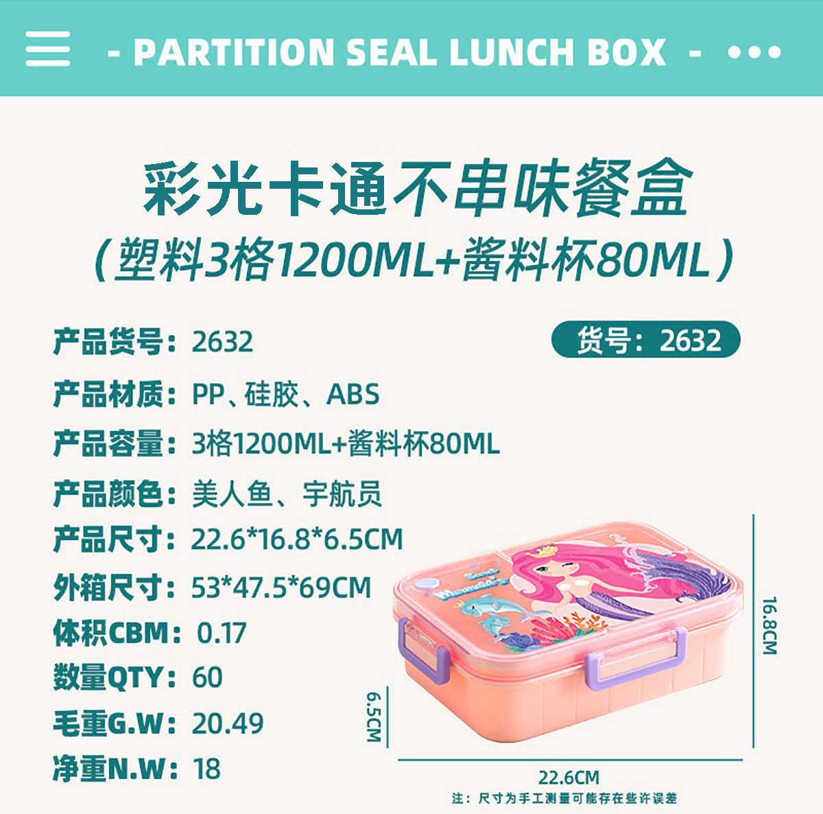 Size: AQX-2631:226*168*65mm/塑料2格1200ml+醬料杯80ml