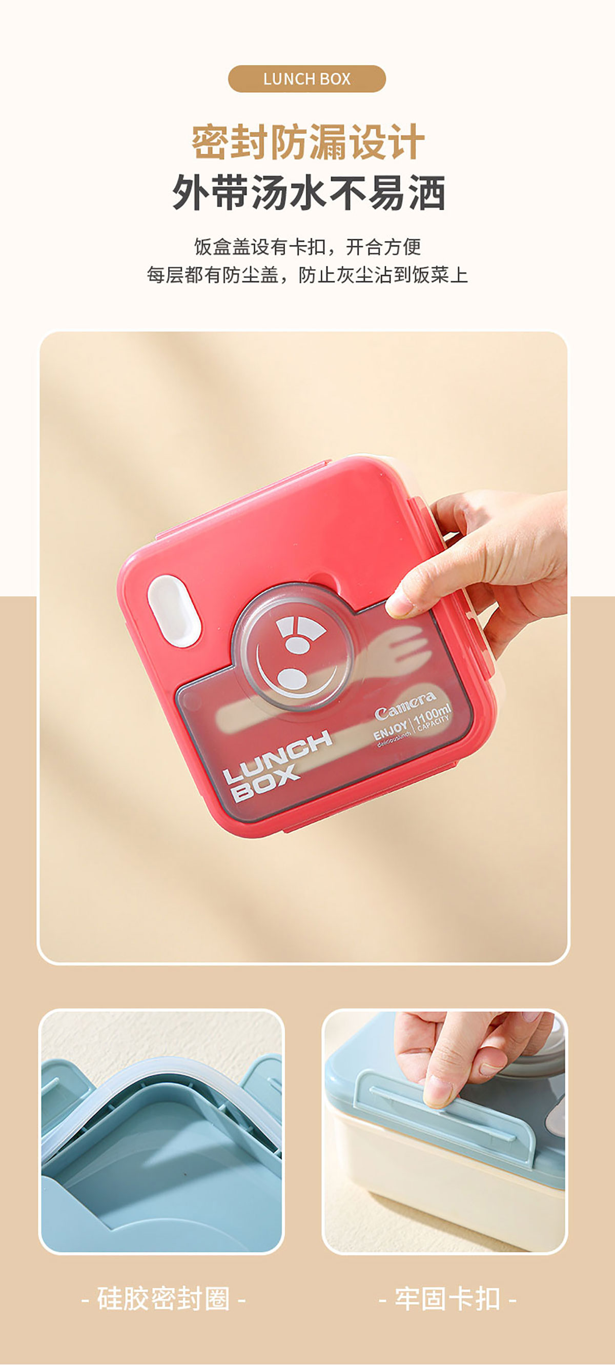 不銹鋼款正方形相機(jī)飯盒(配叉+勺)1100ml